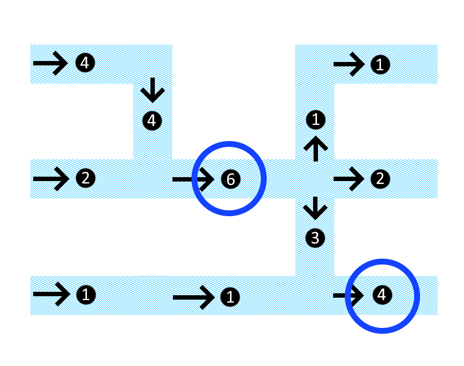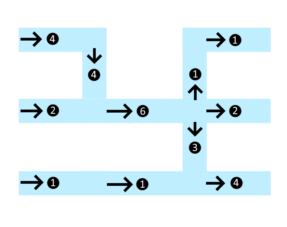 An example of a flow network. The canals are marked blue, possible locations for cleaning machines are marked with black dots. The arrows indicate the direction in which water flows.