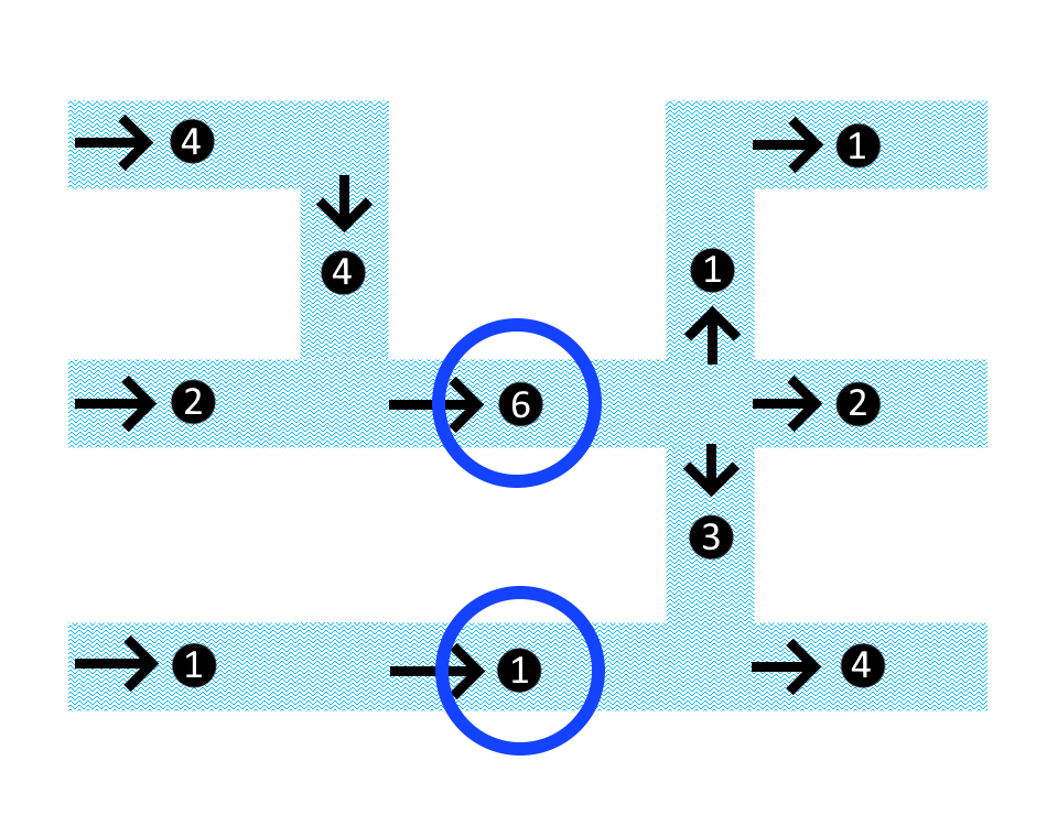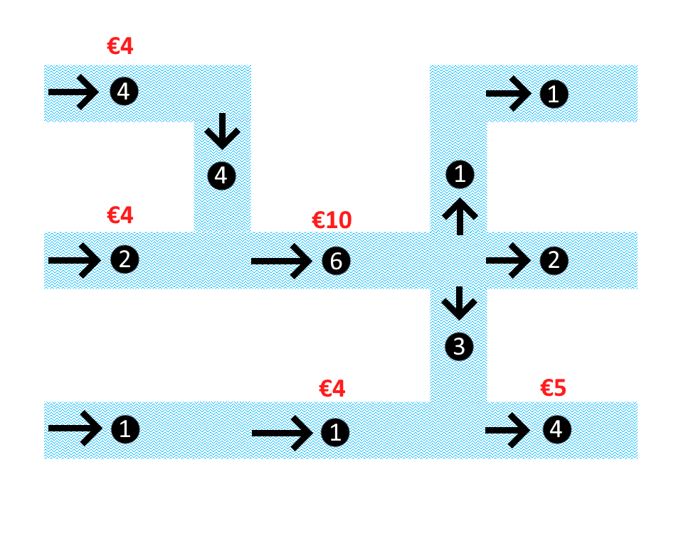 Knowing where plastic soup tends to emerge is not enough to make a good decision. This knowledge needs to be translated into a strategic placement. Here, performing calculations on a mathematical model can help. Let's have a look at what such a mathematical model for this problem could look like. Below is a fictional canal network. Waste comes in from the left, and leaves on the right.
