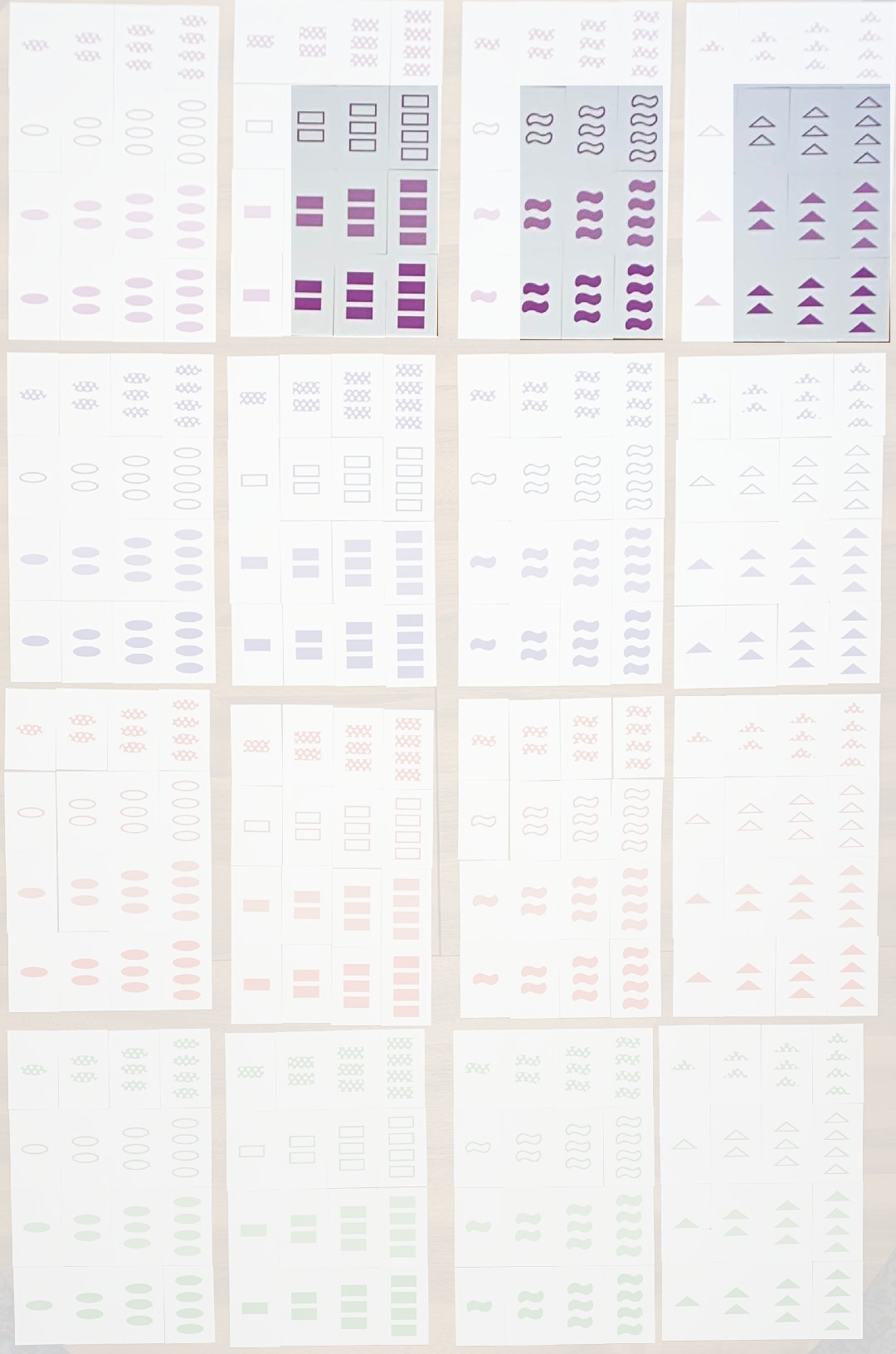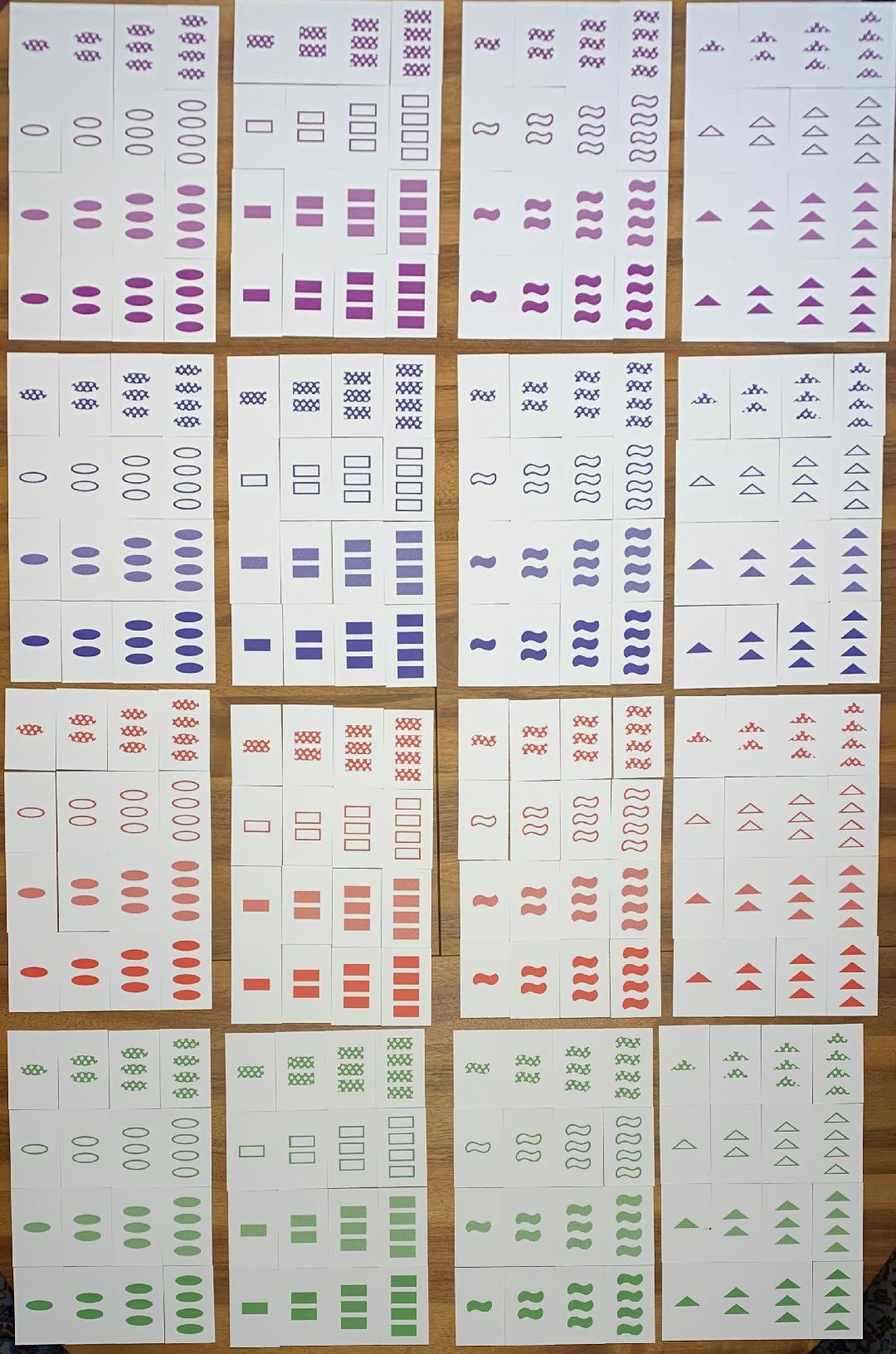 Sets where one feature is the same: For the first card, you can still choose from 256 cards, and for the second card, one feature must remain the same. Suppose you picked the first card in the top left corner (a single purple dotted oval) and you want to keep the color feature the same. The cards are laid out in batches of sixteen, in four rows and four columns. To keep the color the same, you must choose cards from the first row. But all the cards in the first batch of sixteen have the same shape. The other three batches of sixteen do contain cards, each with nine cards: